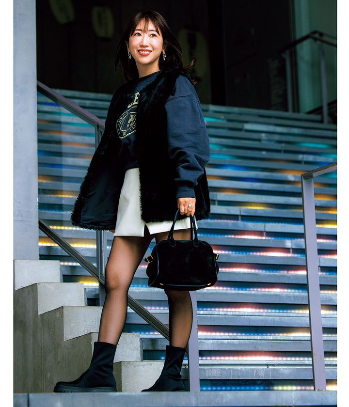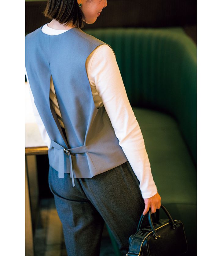 『背中が大きく開いたベストは、前後で表情が異なる一癖デザインが気に入って韓国の店舗で購入。意外性のあるアイテムでコーデの鮮度アップが叶います。』