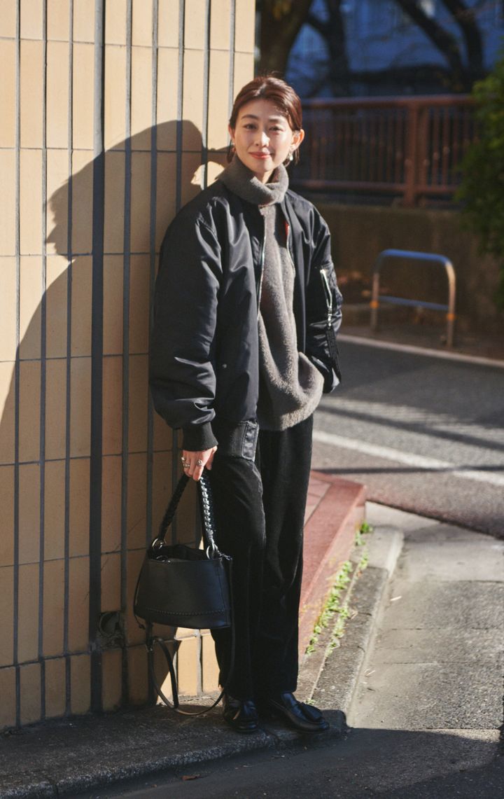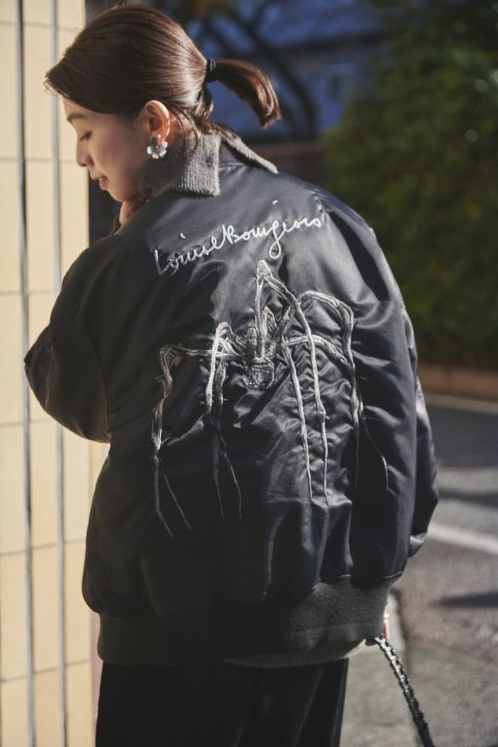 「ルイーズ・ブルジョワ展で購入したSOPH.とのコラボブルゾンは、背中に彼女のアイコニックな作品のひとつである巨大な蜘蛛(ママン)が刺繍された一枚。インパクトがあるので、ほかはシンプルに色みもモノトーンでスタイリングしました。カジュアルになりすぎないよう、ベロアのパンツや柔らかなニット素材を取り入れて女性らしさをプラスしています」