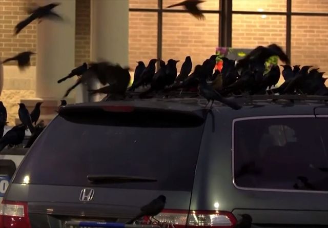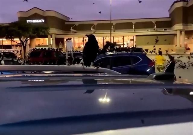 まるでヒッチコック!?大量の黒い鳥がスーパーの駐車場を占拠!この世の終わりのような恐ろしい光景に