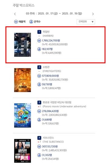 2025年の注目作『ハルビン』は、1月20日(月)の映画館入場券統合電算網配給会社の集計基準で450万人の観客を突破し、公開4週目の週末でも興行ランキング1位を守り抜いた。