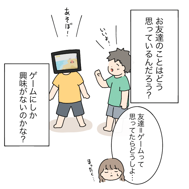 そして、「お友達のことは、どう思っているんだろう?ゲームにしか興味がないのかな?『友達=ゲーム』って思ってたらどうしよ・・」と心配になるのでした。