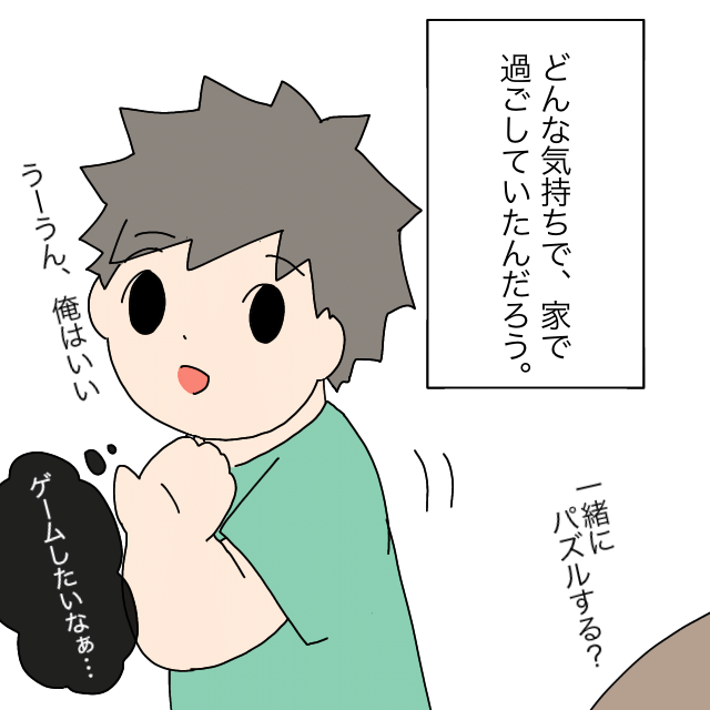 「一体どんな気持ちで家で過ごしていたんだろう」翠さんはタクくんのことを思い浮かべて考えました。「一緒にパズルする?」「う、うん、俺はいい」そんなやりとりをした時も、「本当は『ゲームしたいなぁ・・』と心の中で思っていたのかも」翠さんはそんな風に思いました。