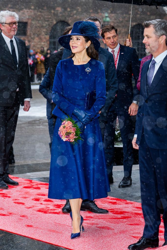 デンマーク議会の王位継承祝賀会でまとったのが、デンマーク発ブランド、ラッセ・シュパンゲンベルのスカートスーツ。フェザー付きの帽子やブローチ、レザーグローブ、シューズとオールブルーの装いが、気品オーラを際立たせています。