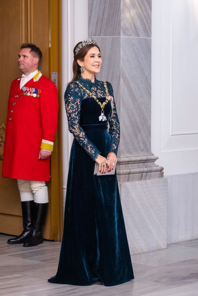 アマリエンボー宮殿で開催されたニューイヤーズ・ガラに王妃として出席。精巧なレースのディテールが美しい、グリーンのベルベットドレスは、デンマーク発ブランド、ビルギット・ハルシュタインのもの。エメラルドのパリュール・ティアラとイヤリングがドレスと見事にマッチしています。