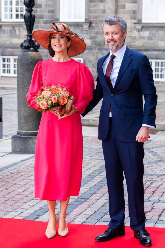 デンマークの憲法制定175周年を記念するイベントに出席。バルーンスリーブが主張する鮮やかなピンクのドレスは、アンドリュー・ゲンのもの。つば広の帽子とブロンズのクラッチバッグ、ローズのブーケもドレスアップを上品に引き立てています。