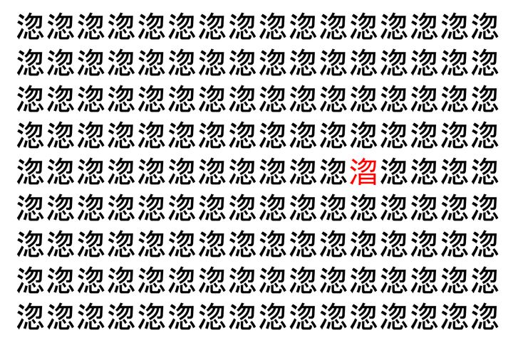 画像の中には、「淴」という漢字が縦に9行、横に16個並んでいます。 全部で144個となりますが・・・、そのうち1つは「異なる漢字」となってますよ!!