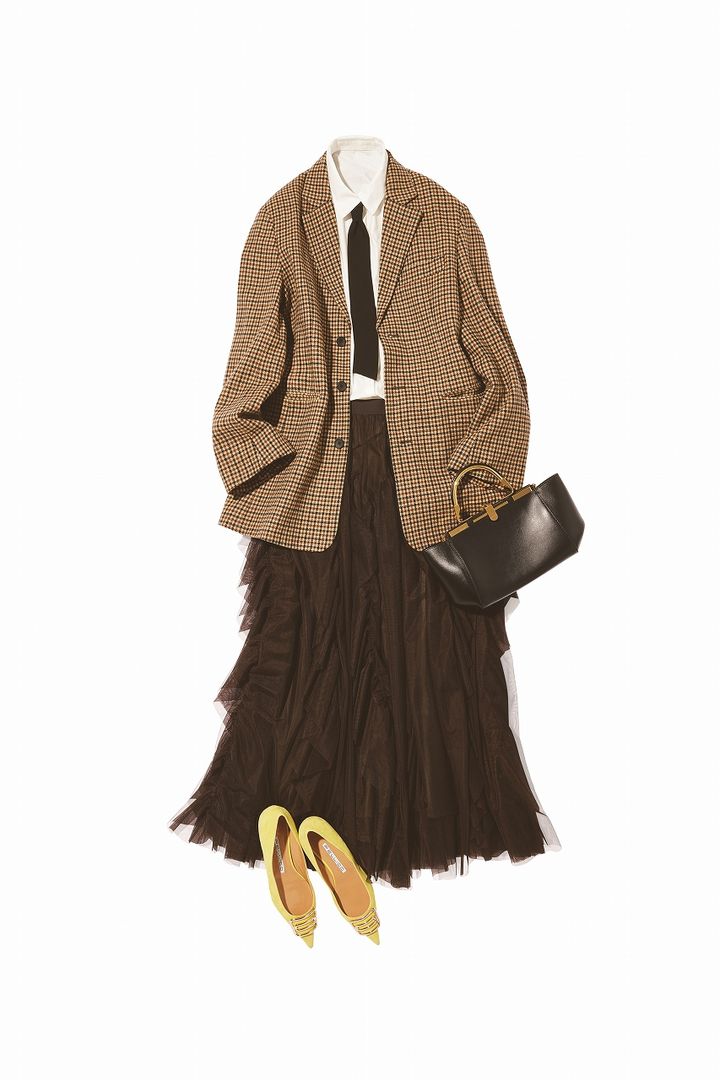 ジャケット¥35,200(メゾンスペシャル/メゾンスペシャル 青山店)ネクタイ付きシャツ¥22,000チュールスカート¥24,200(ともにアルページュストーリー)バッグ¥193,600(ザンケッティ/八木通商)パンプス¥86,900(ペリーコ/アマン)