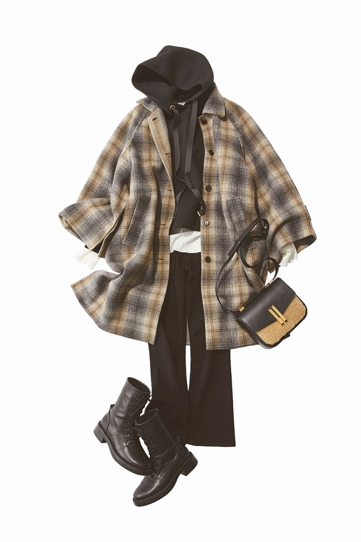 コート¥132,000(ドローイングナンバーズ/ドローイングナンバーズ 新宿店)パーカ¥16,500(シークレット・トロフィー/kokode.jp)カットソー¥13,200(ウィム ガゼット/ウィム ガゼット 青山店)デニムパンツ¥37,400(シチズンズ・オブ・ヒューマニティ)バッグ¥101,200(DEMELLIER/TOMORROWLAND)ブーツ¥60,500(ツル バイ マリコ オイカワ)