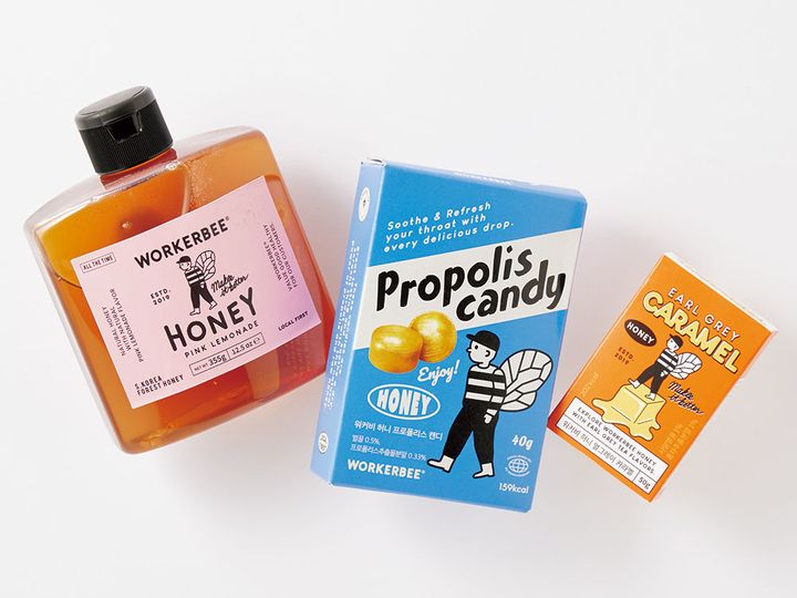 韓国の養蜂農家とミツバチ保護のサポートをするハチミツ専門ブランド。パッケージの可愛さとTWICEのナヨンが愛用ということで人気を後押し。右からキャラメル₩3,200プロポリスキャンディ₩3,800ハチミツ₩24,500 [STORYライター小花有紀おすすめ]