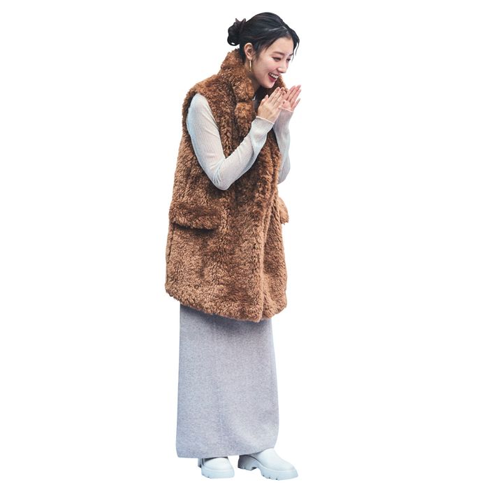 6.ボアベスト¥38,500(カデュネプレスルーム)シアーラメカットソー¥9,900(ノーブル/ノーブル 有楽町マルイ店)ピアス¥15,070(チビ・ジュエルズ/チビジュエルズ・ジャパン)ブーツ¥15,400(ル タロン/ル タロン 有楽町マルイ店)キャミワンピ着回し