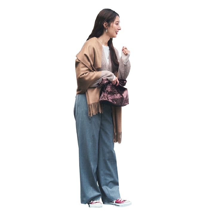 8.白ロンT¥4,950(マルゥ ユナイテッドアローズ/ユナイテッドアローズ カスタマーサービスデスク)グレーパンツ¥33,000(エイチ ビューティー&ユース/エイチ ビューティー&ユース)ストール¥27,500(デミルクス ビームス/デミルクス ビームス 新宿)ネックレス¥23,100(マリハ)ピアス¥23,100(バルブス/ZUTTOHOLIC)スニーカー¥6,380(コンバースインフォメーションセンター)バッグ¥7,260(ル タロン/ル タロン 有楽町マルイ店)カーデ着回し