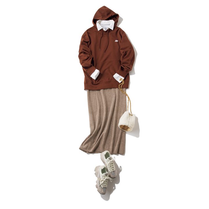 3.フーディ¥8,910(ニューバランス/ニューバランス ジャパンお客様相談室)白シャツ¥23,100(アンド アールシー/カレンソロジー 新宿)スニーカー¥22,000(ニューバランス/ニューバランス ジャパンお客様相談室)ボアバッグ¥132,000(ザンケッティ/八木通商)キャミワンピ着回し