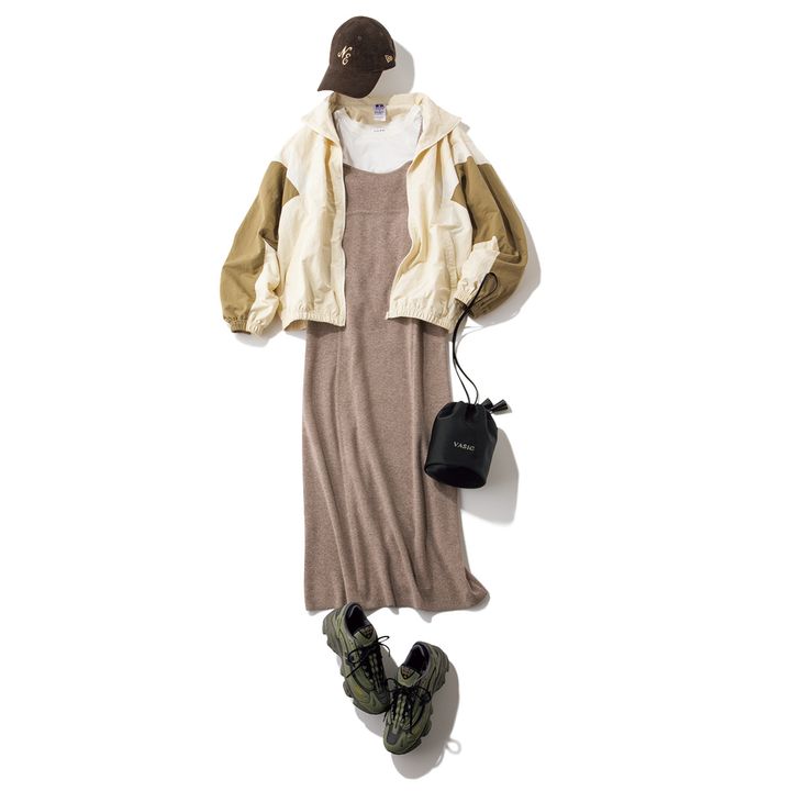 4.シアーラメカットソー¥9,900(ノーブル/ノーブル 有楽町マルイ店)ジャケット¥17,600(ラッセル アスレチック × ビーミング by ビームス/ビーミング ライフストア by ビームス ららぽーとTOKYO-BAY店)キャップ¥4,400(ニューエラ)スニーカー¥18,700(ニューバランス/ニューバランス ジャパンお客様相談室)バッグ¥19,800(ヴァジック/ヴァジックジャパン)キャミワンピ着回し