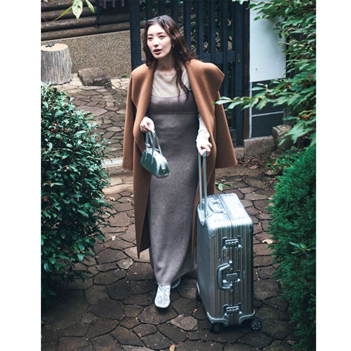 1.ウールコート¥50,600(FRAY I.D/FRAYI.D ルミネ新宿2店)シアーラメカットソー¥9,900(ノーブル/ノーブル 有楽町マルイ店)ピアス¥34,100ハウライトリング¥77,000(ともにマリハ)バングル¥80,520(バルブス/ZUTTOHOLIC)ベルベットブーツ¥16,500(ル タロン グリーズ/ル タロン グリーズ ルミネ新宿店)バッグ¥55,000(マイケル マイケル・コース/マイケル・コース カスタマーサービス)ソックス・スーツケース/ともにスタイリスト私物 キャミワンピ着回し