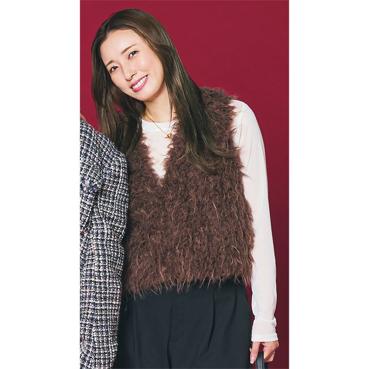 昼は子育て優先でカジュアル服しか着ませんが、夜会では自分軸で選んだGALLARDAGALANTEの華やかなファーベストでおしゃれ欲を満たします。