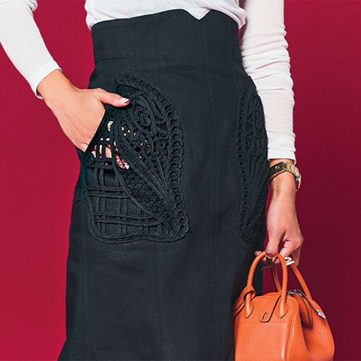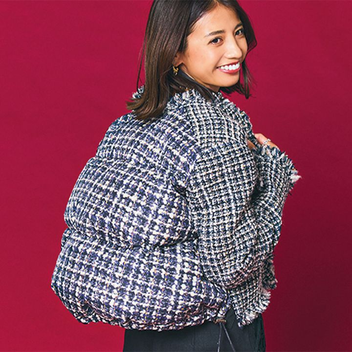 sacaiのアウターは正面はツイード、背中部分はツイードプリントのダウンになったひとクセデザイン。刺繍ポケットが上品なMame Kurogouchiのスカートなど、遊び心のあるアイテムを厳選!