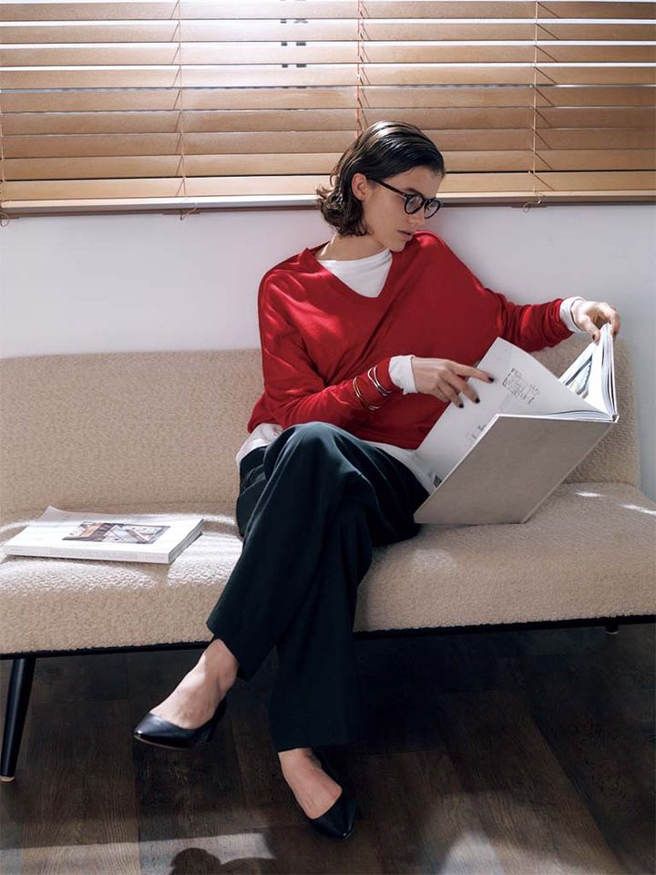 【POINT】コンサバになりがちな薄手の赤ニットは、バングルやブレスレットを重ねて小さく遊び心を加算。なだらかなVネックからのぞくよう白Tを仕込み華やかさを微調整。