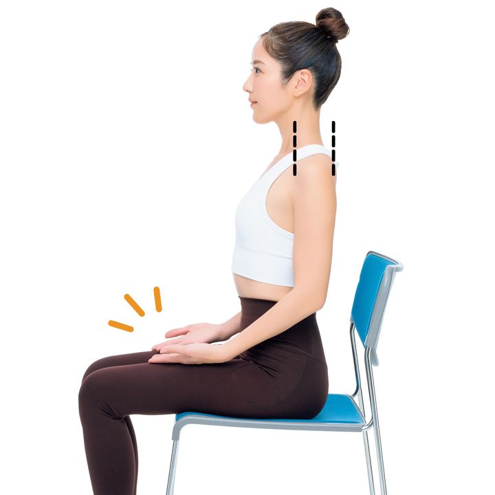 通常、座るときは太腿に手の平を乗せますが、これは肩関節が内旋した状態。手の平を上に向けるだけで肩関節が外旋し胸が開きます。