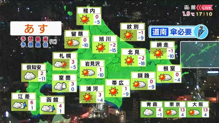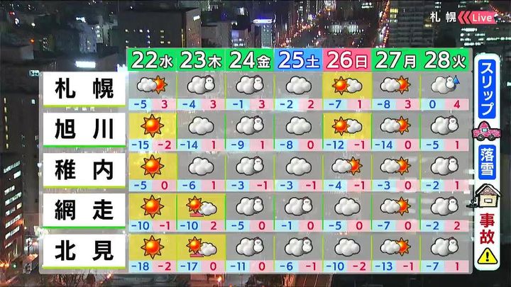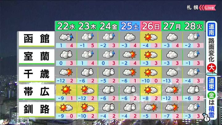 道南方面で雪や雨が降るほかは晴れるでしょう。最低気温は内陸や道東方面で21日朝より大幅に低く、北見の‐18度は21日朝より14度も低いでしょう。日中は21日と同じくらいです。