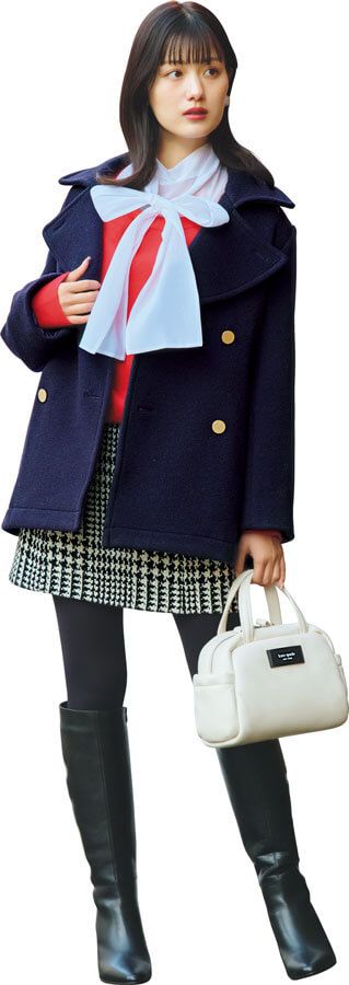 きちんと感あるアイテムが似合うストレートさんは、ピーコートは正統派トラッドに着こなすのが最適解。ボトムはコンパクトに徹して、細長のIラインを目指して。台形ミニ×ロングブーツですらり見えを強力に後押し。ブラウスはシアー素材にして、レイヤードの厚みをセーブ。