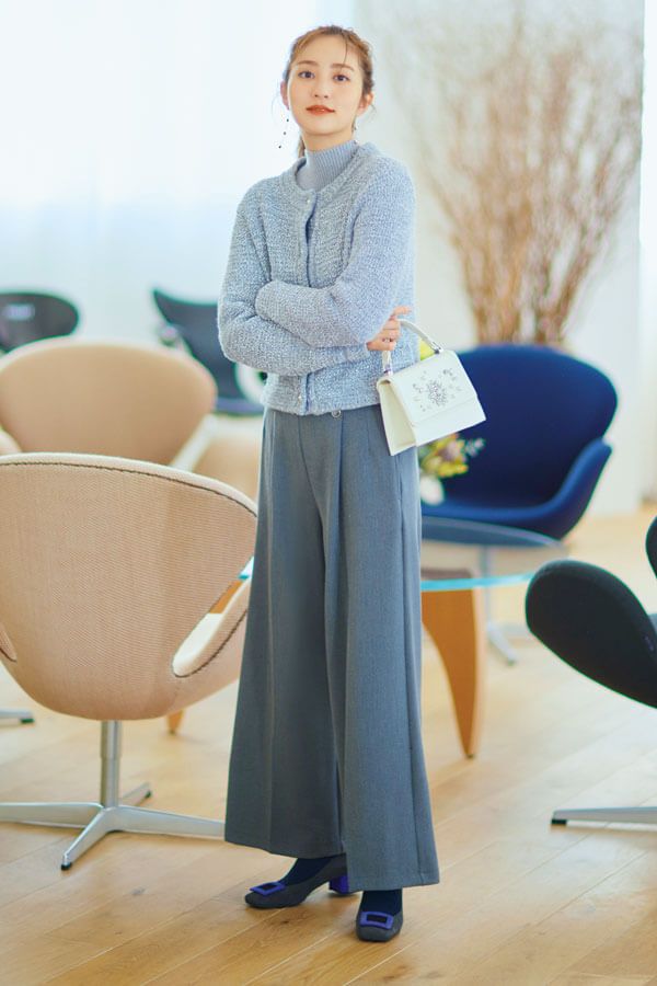 カーディガン¥19,800/ストロベリーフィールズ(シュガー•マトリックス) ニット¥1,650/clear(clear 新宿ミロード店) パンツ¥6,490/アストリア オディール(アストリア オディール ルミネエスト新宿店) ピアス¥2,750/RESEXXY バッグ¥14,300/MERCURYDUO タイツ¥1,100/満足(福助) 靴¥22,550/モード・エ・ジャコモ(オギツ)
