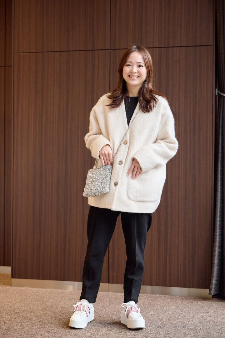 「アウターの色とキラキラバッグに合わせてこのスニーカーを選びました。低身長に加え、足のサイズが21.5㎝なので見た目のバランスは特に気を付けて購入します。厚底に存在感のあるデザインが多いなか、これはソール部分がシンプルでアッパーとのバランスがよく、キラキラなものが好きな私にとって即決アイテムでした」飯海菜月さん/34歳・155㎝・薬剤師(1歳の女の子ママ)