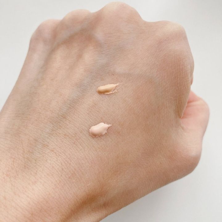 そうなんです!これ2月4日に発売されたらぜひ試してほしい名品です。Mちゃんと筆者はよりトーンアップしてくれるピンク推し。肌色がワントーン明るくなり、イエベ特有の黄ぐすみもカバーしてくれるように感じます。くすみ、毛穴をふんわりと隠してくれ、上品なツヤ肌に。休みの日はこれに次に紹介するパウダーだけで肌を仕上げても十分ですし、しっかりメイクしたい日は好きなファンデをはさんでもOK。手持ちのファンデーション、さまざまなメーカーのものと組み合わせてみましたが、特にモロモロなどが出てくることもなく万能なんじゃないかなと思っています。もちろんプラセンタエキス配合。肌調子を整えてくれるのはもちろん、更にハリやキメ、紫外線を浴びた肌の回復に有効な成分も配合されており、スキンケアの延長として使えるような化粧下地なんですよね。ピンクでも全く不自然なトーンアップにはなりませんが、よりナチュラルでヘルシーな仕上がりを求めるのであれば、ナチュラルカラーがオススメです!