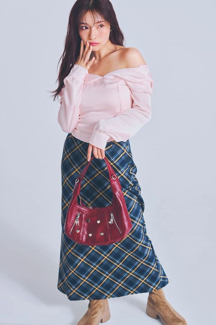 ピンクサテンブラウス 11,200円/ノットユアローズ(HANA)ネイビーチェックロングスカート 2,599円/GRL イヤリング 2,530円/アネモネ(サンポークリエイト)バッグ 3,289円/スピンズ ブーツ 22,000円/プラス ダイアナ(ダイアナ 原宿店)