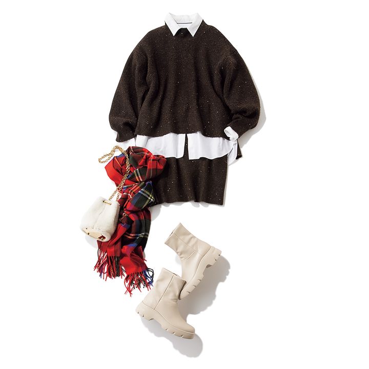8.白シャツ¥23,100(アンド アールシー/カレンソロジー 新宿)ストール¥29,700(トラディショナル ウェザ ーウェア/トラディショナル ウェザーウェア ルミネ有楽町店)ブーツ¥15,400(ル タロン/ル タロン 有楽町マルイ店)ボアバッグ¥132,000(ザンケッティ/八木通商)スパンコールニットセットアップ着回し