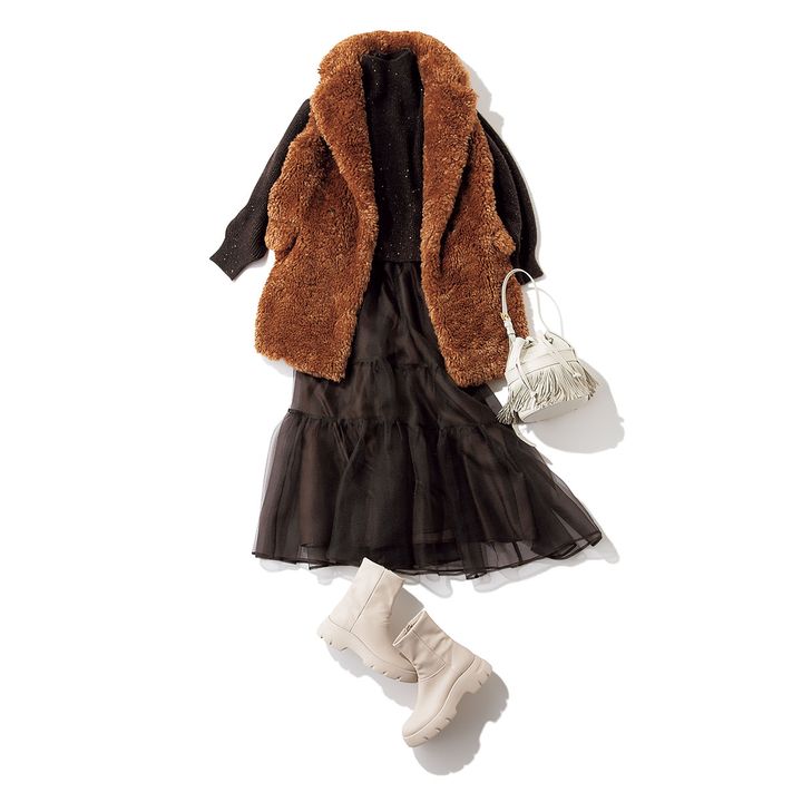 3.チュールスカート¥20,900(アルページュストーリー プレスルーム)ボアベスト¥38,500(カデュネプレスルーム)ブーツ¥15,400(ル タロン/ル タロン 有楽町マルイ店)バッグ¥148,500(J&M デヴィッドソン/J&M デヴィッドソン カスタマーセンター)スパンコールニットセットアップ着回し