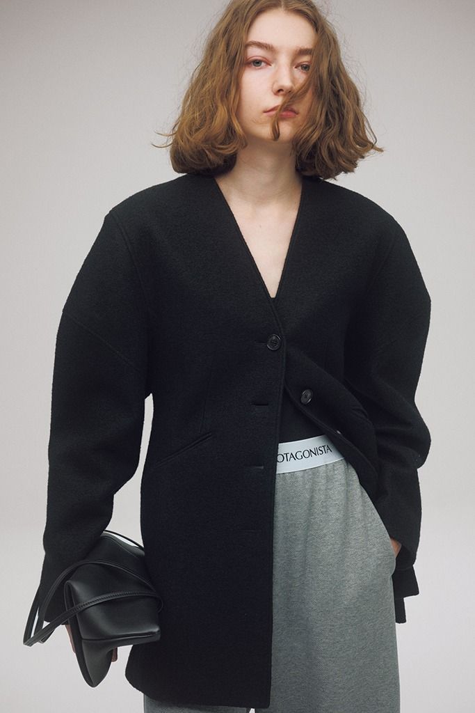 えりのないデザインと相まってオーバーサイズでもシャープなまま。スタイリング全体をかっちり見せつつ、一歩まちがえるとコンサバに傾いてしまう黒ジャケット。ほどよくモードに転ばせられるシルエットと厚みが重要に。 黒ジャケット/AKIRANAKA(ハルミ ショールーム) グレーパンツ/プロタゴニスタ(アマン)