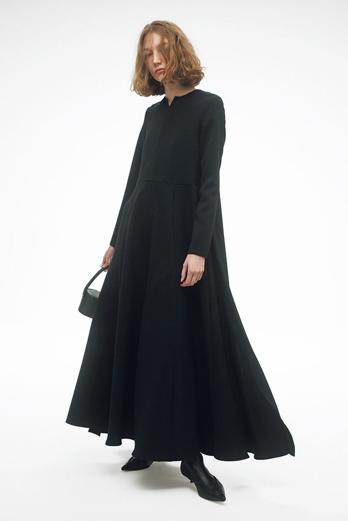 シルエットの抑揚も極力省き、落ち感を生かしたすそにかけての広がりが特徴のロングワンピース。あれこれ手をかけるのがもったいないと思わせるほど、黒の凜とした表情が引き立つ完成度の高いルックスは、たった1枚でも高い満足感が得られる。