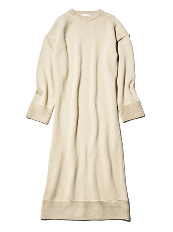 甘く転びがちなベージュワンピースは、ざっくりとしたラフな編み地と、ほどよい厚みを選択基準に。重ね着しやすいシンプルな丸首とまっすぐなフォルム。ゆったりとした身幅なら、体のラインを拾わないうえに、レイヤードするインナーで遊べるメリットも。どんな色ともケンカしないまろやかなベージュの色みもポイント。
