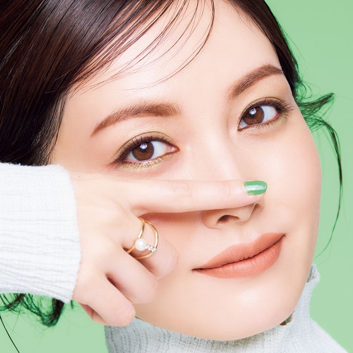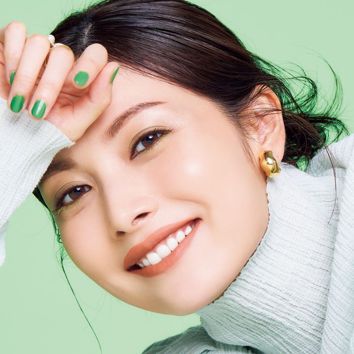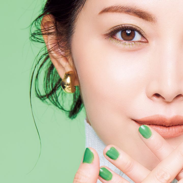 メイクに取り入れるにはハードルが高いと思われがちなグリーンは、ポイントを押さえればこなれ感を出せます。アイシャドウは二重幅にのせ、ブラシでスワイプしながらアイホール上部にぼかしていくと絶妙に馴染み、変に浮きません。マスカラは下まつ毛のみにのせることで抜け感を。普段とは違う遊び心のある目元に仕上がります。一度塗りでも十分に主張する鮮烈グリーンは指先に宿して。