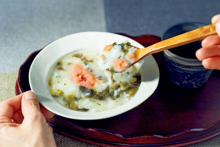 温かくてほっこりするおかゆで、胃も心もリフレッシュ。お餅のとろける食感に、明太子や高菜のうまみがアクセントになってやみつきに。
