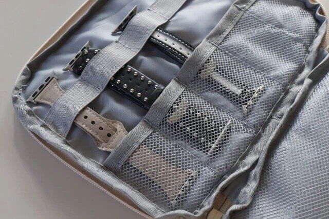 アクセサリー感覚で付け替えたいスマートウォッチバンドを収納できる専用ケース!片側には充電器やカバーなど、他のガジェット類入れておけるメッシュポケット付きです♡