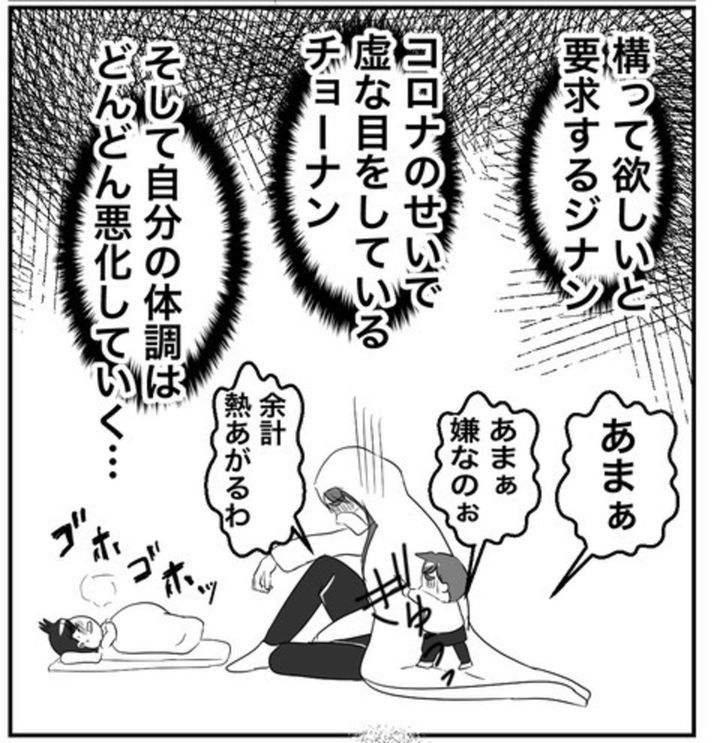 長男がコロナに感染してしまいました。夫を頼ることができず、一人で長男の看病と次男の相手をしていたキナコさん。ところが、とうとうキナコさんもコロナに感染してしまったようです。寒気が止まらず、しんどい状況ですが、子どもたちを放っておくわけにはいきません。