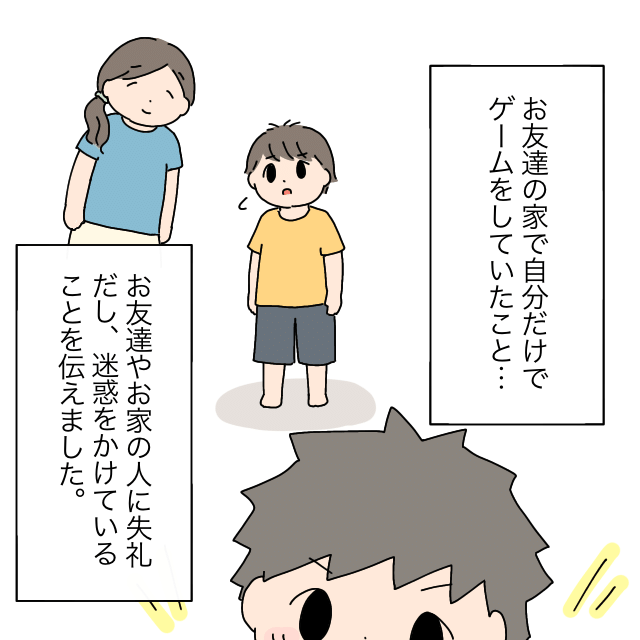 そして、お友達の家で、自分だけゲームをしていたことは、お友達やお家の人に失礼だし、迷惑をかけているということを伝えたのでした。