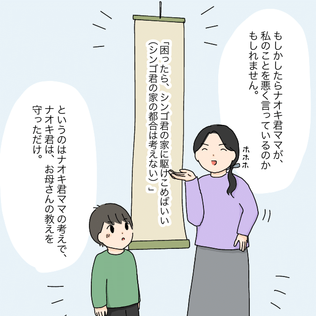 「もしかしたら、ナオキくんママが私のことを悪く言っているのかも」そう思ったママ。「困ったら、シンゴくんの家に駆け込めばいい。(シンゴくんの家の都合は考えない)」という考えは、「ナオキくんママのもので、ナオキくんはお母さんの考えを守っただけなのかも」
