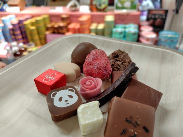 ヘーゼルナッツのチョコレート〈プラスリン〉を試食。ナッツの香ばしさとチョコレートの甘さが相性抜群です。