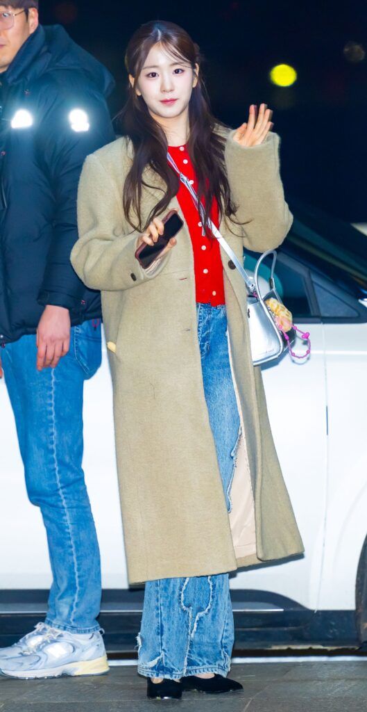 「大胆かつクラシックな赤にベージュの組み合わせは最強にかわいい♡クラシックになりすぎないよう、あえてデニムを合わせてカジュアルダウン。足元はフラットシューズを合わせて抜け感たっぷり!パリジェンヌのような雰囲気に。ウヨンさんの可愛らしさがシルバーのバッグチャームに込められていて素敵です♡」(スタイリスト・阿部絵莉香)