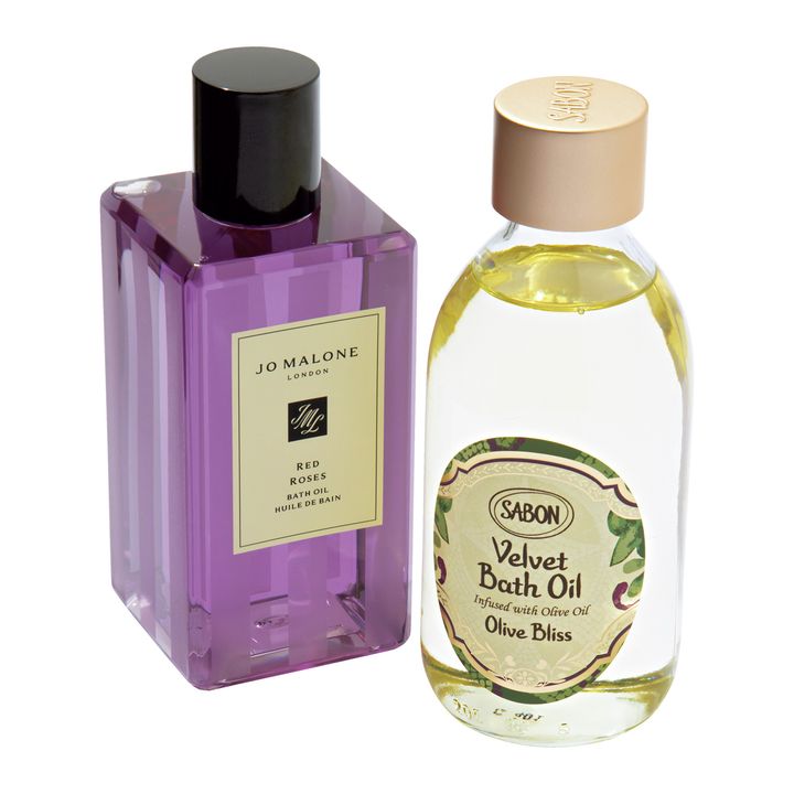 左:世界中から集めた高貴な7種類のバラをブレンド。ピンクのバスオイルで開運!ジョー マローン ロンドン レッド ローズ バス オイル 250ml ¥12,430(ジョー マローン ロンドン)右:お湯に入れるとミルキーなテクスチャーに。SABON ベルベットバスオイル オリーブ・ブリス 200ml ¥4,290※12月26日発売(SABON)