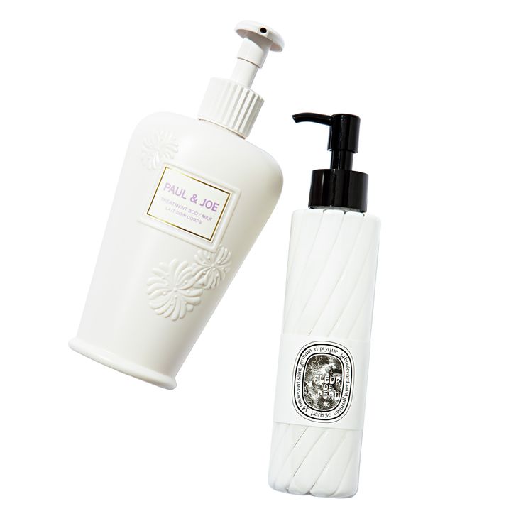 左:シトラスフローラルが翌朝までやわらかく香るボディミルク。トリートメント ボディ ミルク250ml ¥3,850(ポール & ジョー ボーテ)右:色っぽいムスクの香りが1日中楽しめます。ディプティック ハンド&ボディローション フルール ドゥ ポー 200ml ¥9,460(ディプティック)