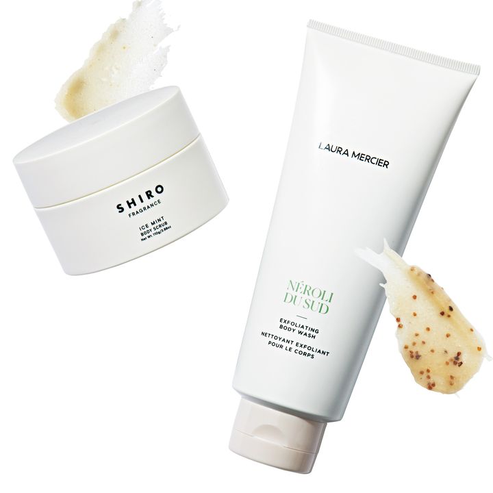 左:鹿児島県シラス台地の火山灰スクラブが古い角質をすっきりオフ。SHIRO アイスミント ボディスクラブ 110g ¥3,080(SHIRO)右:肌をいたわりながら透明感を与え、滑らかに整えます。ローラ メルシエ エクスフォリエイティング ボディウォッシュ ネロリ200ml ¥7,150(ローラ メルシエ ジャパン)