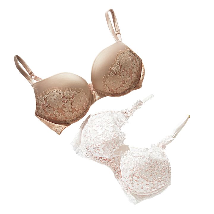 上:花の年にはピンクや赤がおすすめ。ピンクベージュブラジャー¥8,990(インティミッシミ/インティミッシミ 渋谷文化村通り店)下:花柄やレースなど気分がアガる下着も開運に。ピンク×ホワイトレースブラジャー¥26,400〜(ユエ/ワコールお客様センター)