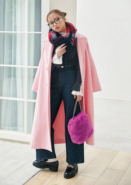 ブラウスのフリルも、コートの鮮やかなピンクも、暗色のニットとデニムによって適度な甘さにまとまる。