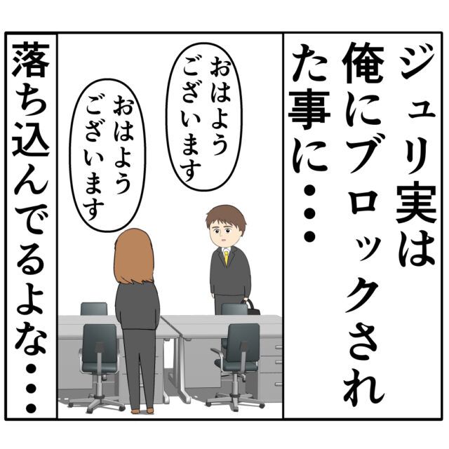 会社ではいつも通りにしていたろみ緒さんですが、「ジュリ実は俺にブロックされた事に・・・落ち込んでるよな・・・」と心苦しく思っていました。