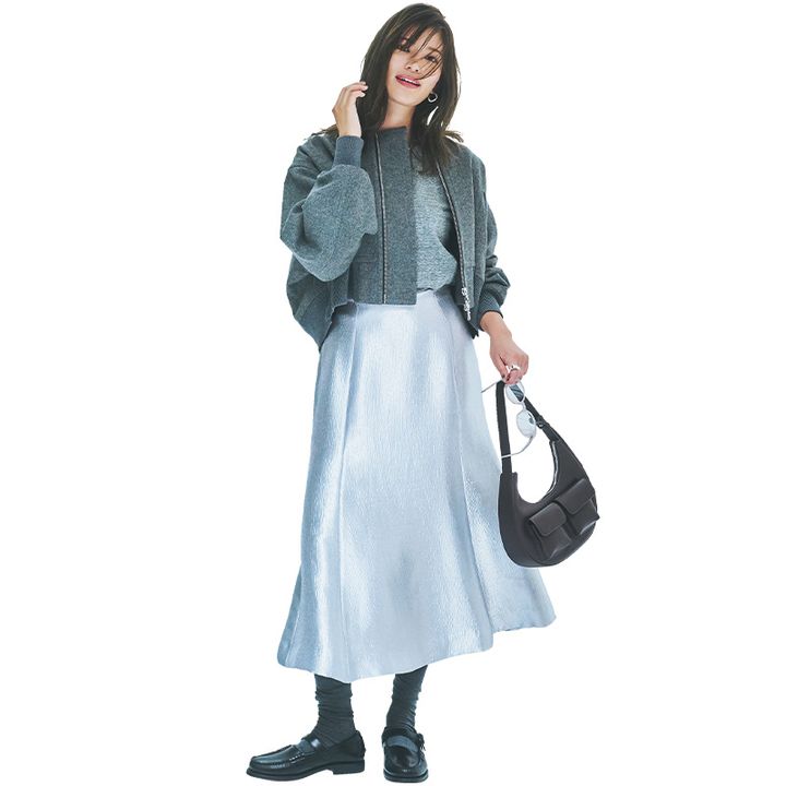 素材感のある主役級スカートは コンパクトなアウターでメリハリを。 グレートーンでなじませて