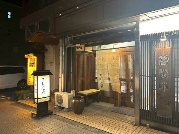 あたたかみのある灯りと「そばの実」の字体が非常にいい雰囲気の外観