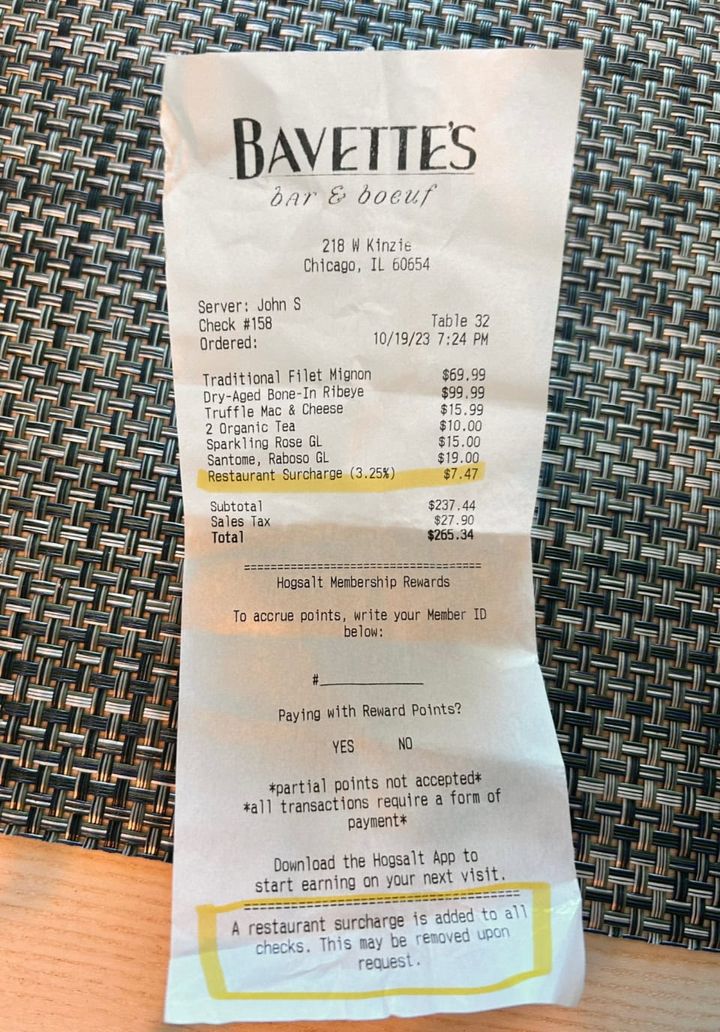 私が利用したレストランでは、実際にあらかじめ3.25%のRestautant Surchargeが計上されていました。会計時に店員に渡すレシートにはチップを書く欄があるので、そこには当初渡そうと思っていたチップの率から3.25%差し引いた額を記入しました。